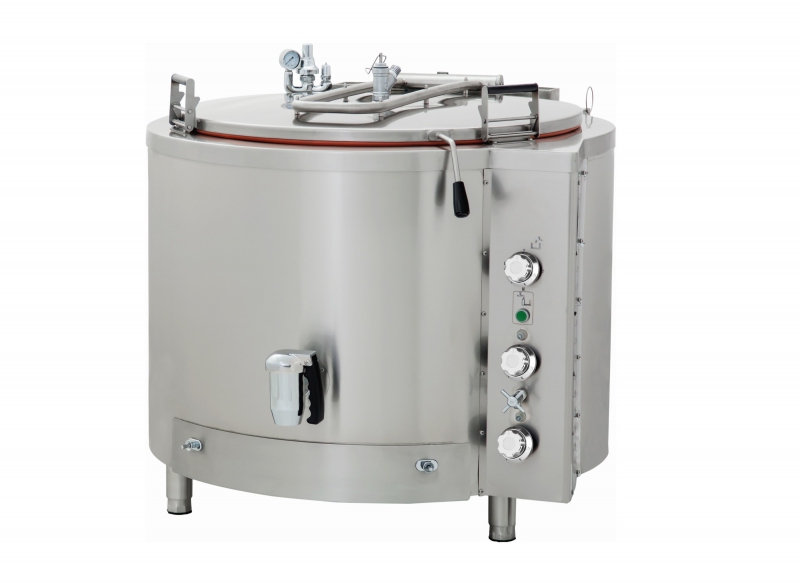 Ta kotel ima dvojno steno, kjer je notranjost napolnjena z vodo. Posledično se ne segreva neposredno z dna kotla, temveč bolj enakomerno po celotni steni. Ta sistem posrednega segrevanja zmanjšuje tveganje za zažganje hrane, zaradi česar je idealen za pripravo tekoče hrane, kot so juhe, omake, jušne osnove in kreme. Izolacijski material, iz katerega je izdelan kotel, prav tako zmanjšuje morebitne toplotne izgube, tako da je poraba energije čim manjša. Poleg tega varnostni termostat ščiti pred nizko gladino vode, da se jedi ne segrejejo prehitro. Na vrhu kotla je nameščen praktičen manometer za odčitavanje tlaka.
